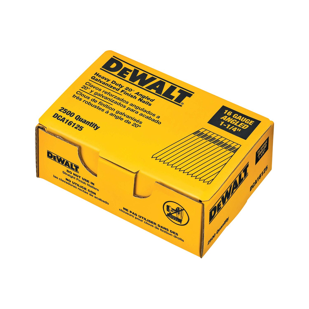The DEWALT DCA16125 1-1/4 In. x 16 gauge 20-degree finish nail are manufactured out of cold-worked carbon steel and galvanized in a hot-dip process, which ensures that each nail will resist rust and moisture. Ideal for finish work, these 1-1/4 In. 16 gauge nails are packaged in quantities of 2,500.