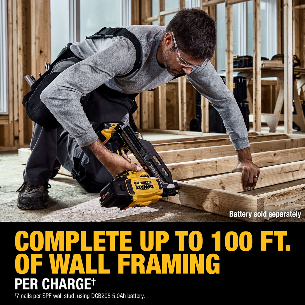 Complete a wide variety of framing jobs with the DEWALT 20V MAX* Brushless Cordless 30 degree Paper Collated Framing Nailer. Designed to help minimize downtime between shots with an innovative flywheel that stays active for 6 seconds after the trigger is released, this lightweight cordless nailer removes the need for hoses and compressors. Install up to 530 sqft of subflooring per charge** and complete up to 100 ft. of wall framing per charge  with this next-generation tool that delivers powerful performance in a wide range of applications. [Battery and charger sold separately.]
