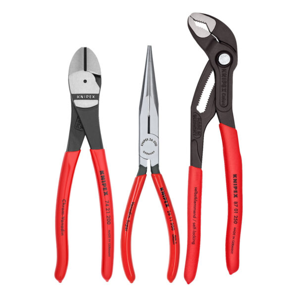 Includes 1 each of: 8″ Long Nose Pliers w/ Cutter (26 11 200), 8″ High Leverage Angled Diagonal Cutters (74 21 200), 10″ Cobra® Pliers (87 01 250)