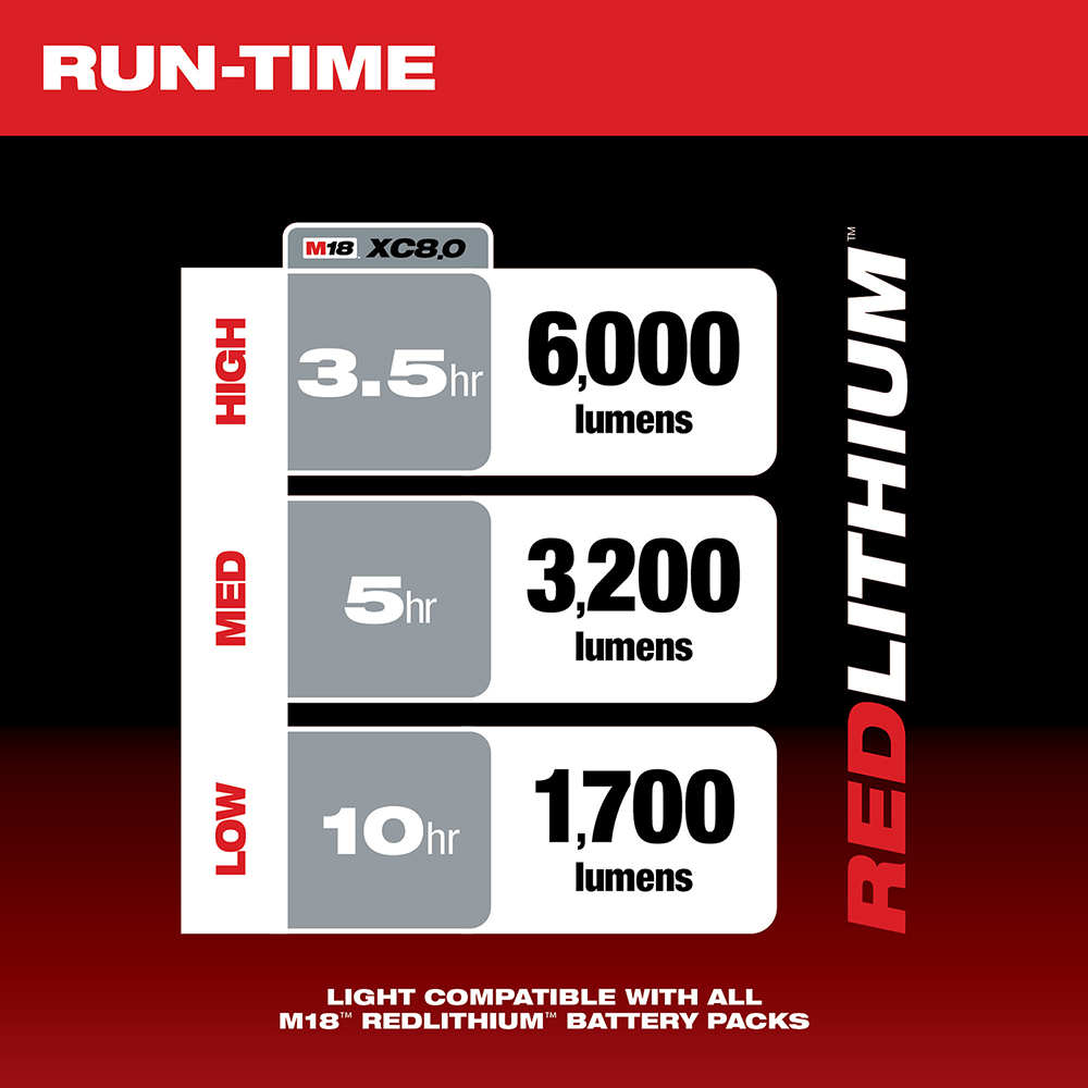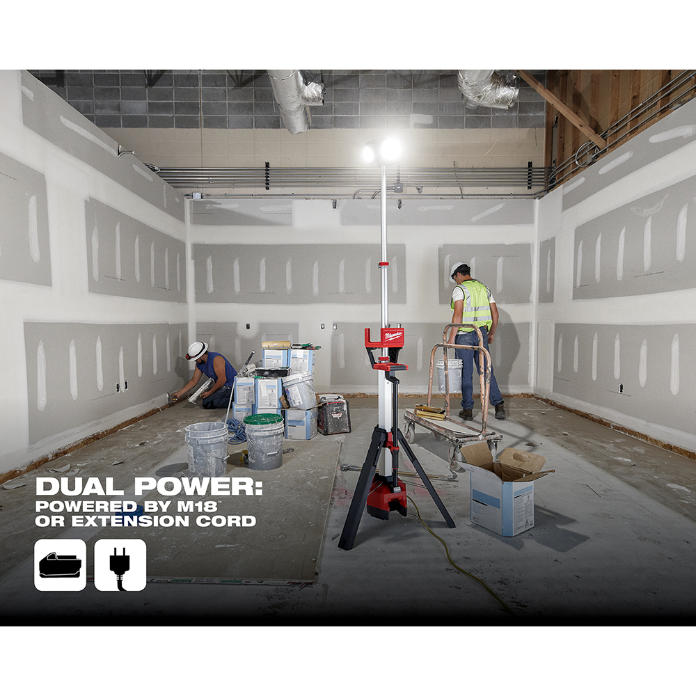 The Milwaukee M18 ROCKET Tower Light/Charger is designed to deliver a lighting solution that adapts, performs, and survives to the jobsite. This light tower sets up in seconds to a max height of 7′ and collapses to less than 4′ for easy transportation and storage. The LED light head can be extended from 4-7′ to light overhead work or minimize shadows when casting shine downward. The multidirectional light head allows users to orient the three independently pivoting light heads to cast light in several directions. The integrated AC plug allows the light to be plugged in with a standard extension cord and charges any M18 REDLITHIUM pack or use the USB port to charge devices on site. Delivering 6,000 lumens, it fills up large areas with TRUEVIEW High Definition light. For optimized control over the output and run-time, the M18 ROCKET LED Light has three output settings. The LEDs never need to be replaced and are backed by a limited lifetime warranty.