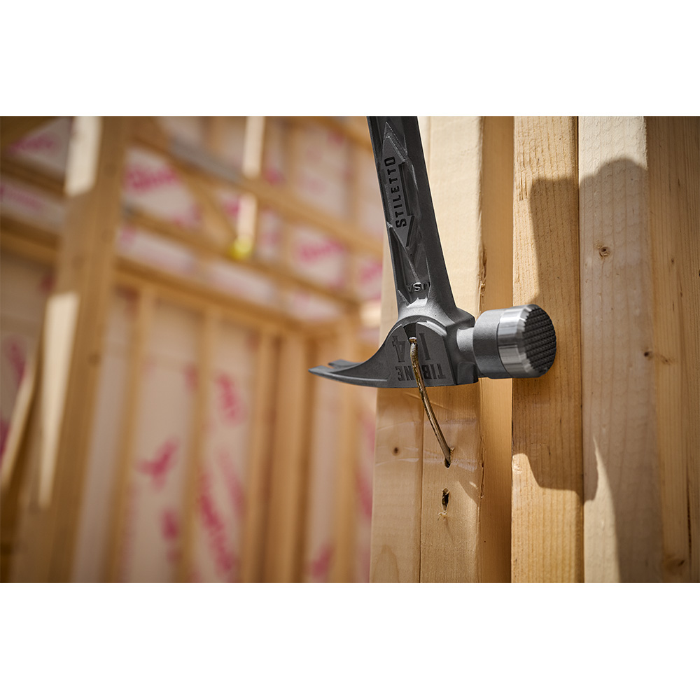 The STILETTO® 14oz TIBONE™ Hammer with Milled Steel Face and Curved Handle is Stiletto Tool’s most powerful and most durable hammer. This All-Titanium hammer is 45% less weight and hits like steel. The durable TIBONE™ design is best for framing and pulling nails. The 180° Side Nail Puller and Magnetic Nail Starter fit up to 16D and Duplex Nails. The TIBONE™ Titanium Framing Hammer features a replaceable steel face and multiple grip colors, extending the life of the hammer and providing a personal touch.